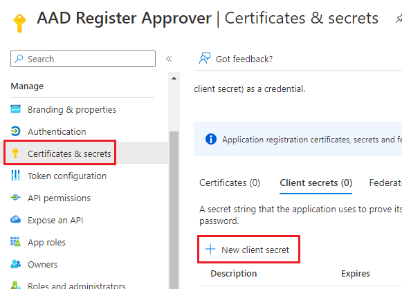 On the left, select Certificates & secrets > New client secret.