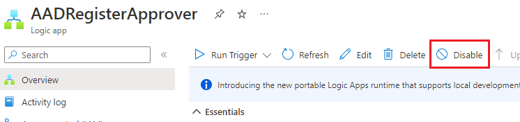 Select the new Logic App > Select Disable at the top to stop it from running while you make changes.