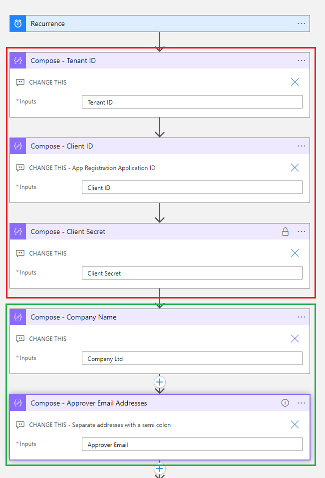 Expand the following Compose actions and populate each one with he equivalent information that was copied during the App Registration steps.