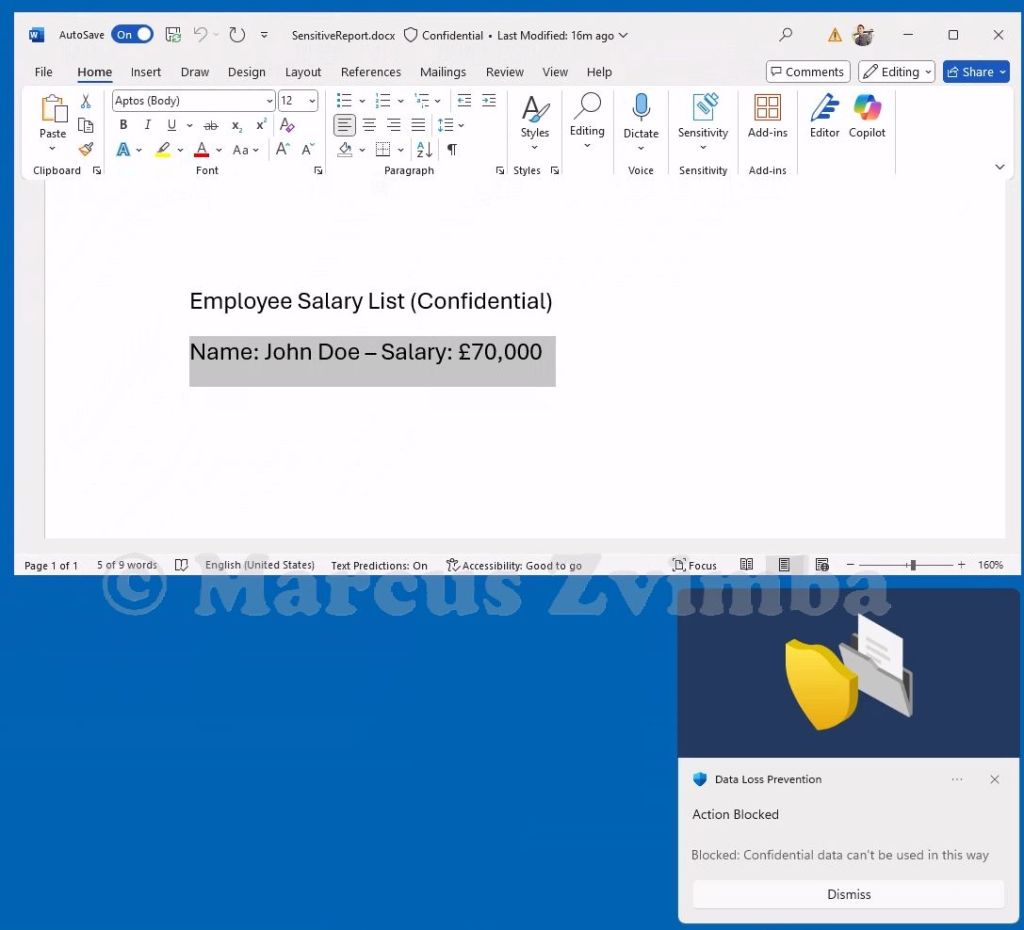 We try the same with any data in SenstiveReport.docx and it is also blocked.