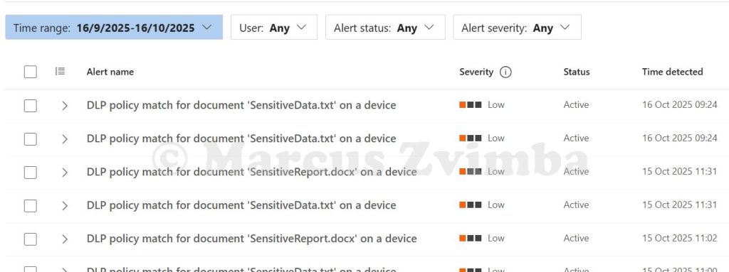 Lastly, go to Purview portal > Solutions > Data Loss Prevention > Alerts. Here we see the Low priority alerts we configured to trigger in the DLP policy.