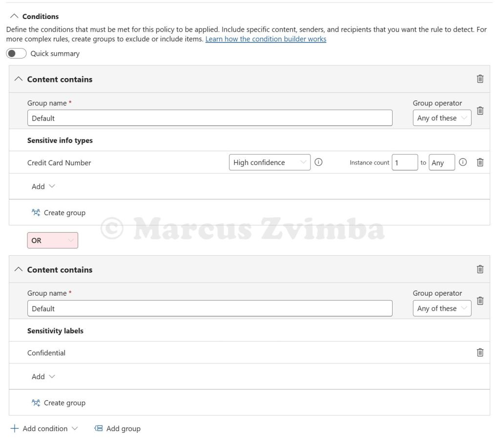 - Additionally, add Sensitivity label as a condition. Select the label Confidential. Now the rule will trigger if the file has that label OR matches an SIT. You can have multiple conditions; by default it’s “Any condition matches”.