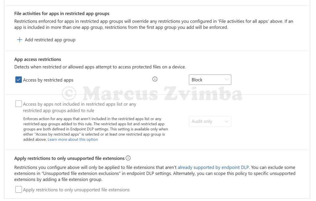 - Under App access restrictions > Tick Access by restricted apps > Select Block. This corresponds to any app we put in the restricted list trying to open the file.