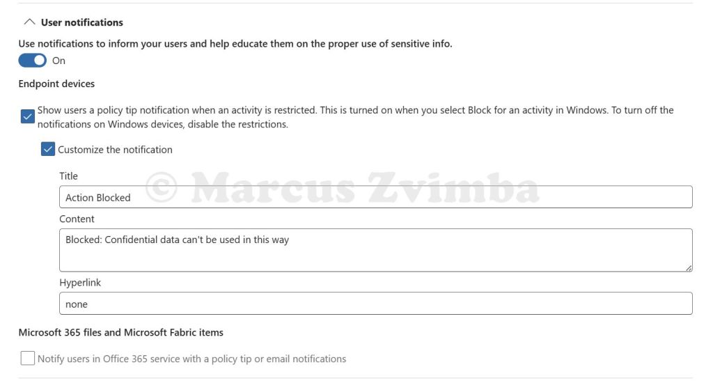 - Toggle “User notifications” on for endpoint. This ensures the user sees a popup when the policy triggers. You can customise the message if you like (“Blocked: confidential data can’t be used with this app”) but it’s optional.