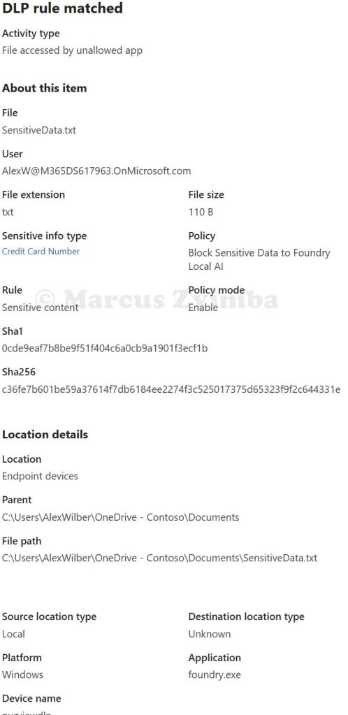 We successfully showed that Microsoft Purview Endpoint DLP can safeguard sensitive files from being processed by a local AI model. By configuring foundry.exe as a restricted app and creating a DLP policy to block its access to classified data, the system prevented the data from ever leaving its file – the AI got nothing.