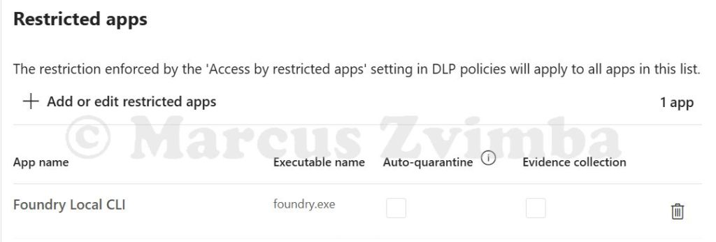 Hit Save. You should now see “Foundry Local CLI (foundry.exe)” in the Restricted apps list.