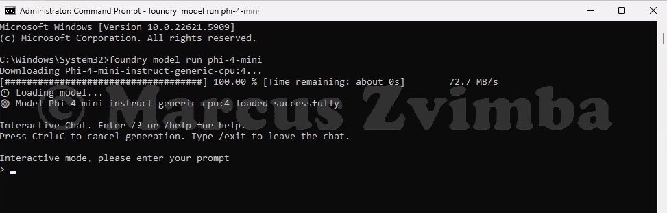 You’ll see some logs of model loading, then a prompt like Foundry > indicating it’s ready for input.