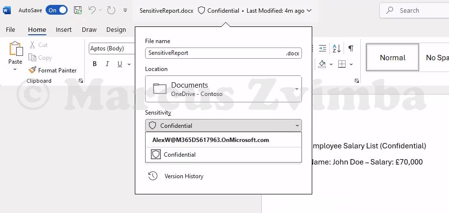 - Create a second test file and apply a sensitivity label: Copy the text into a Word document but remove the credit card number. If you have sensitivity labels published (like “Confidential” or “Highly Confidential”) we can use these, otherwise you will need to publish a new Purview Information Protection sensitivity label. I saved a copy as SensitiveReport.docx and applied my “Confidential” label.