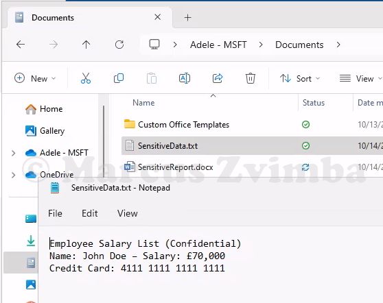 Now we have two files that are definitely sensitive. Purview can identify them either via the sensitivity label metadata or by scanning the content (e.g. detecting that 16-digit number as a credit card number).